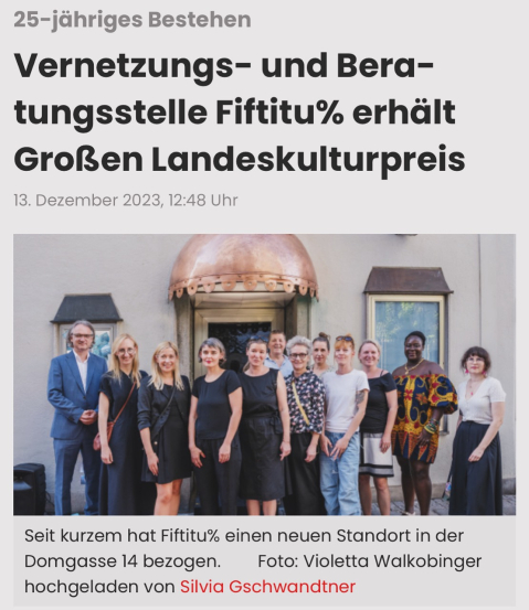 Mit dem Großen Landespreis für Initiative Kulturarbeit wird die Vernetzungsstelle für Frauen* in Kunst und Kultur Fiftitu% ausgezeichnet.