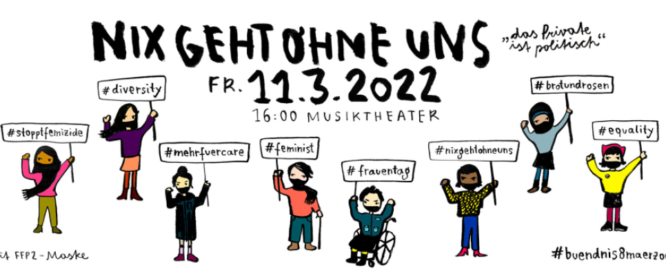 Am Freitag, den 11. März 2022 treffen wir uns um 16 Uhr vorm Musiktheater in Linz danach gehen wir gemeinsam über die Landstraße bis zum Hauptplatz um lautstark auf die ungerechte und mittlerweile untragbare Situation der Frauen aufmerksam zu machen. Denn es reicht! Und wir wissen alle: „Nix geht ohne uns!“ Komm allein, mit deinen Freund*innen, deiner Familie - SEI DABEI!