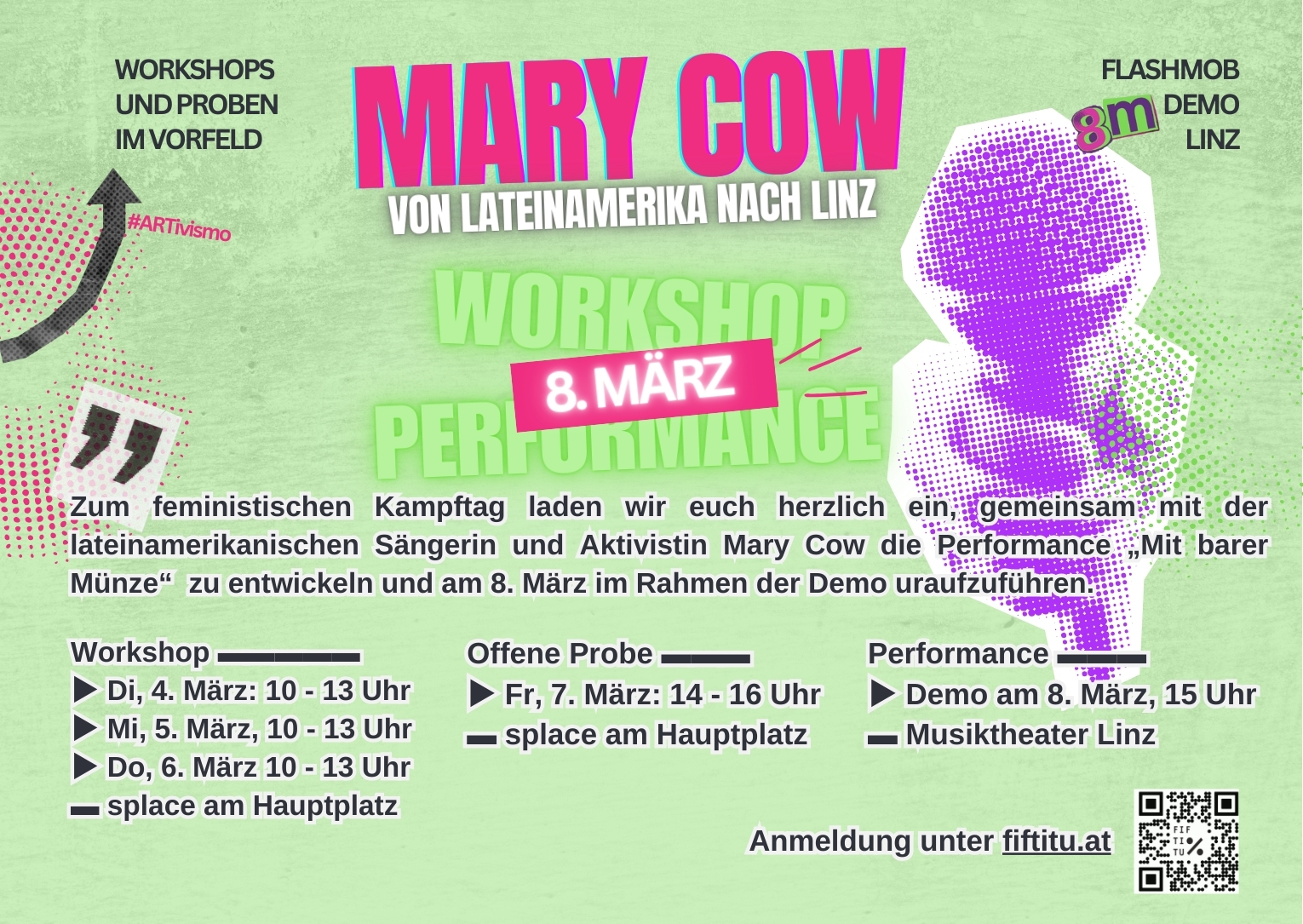Zum feministischen Kampftag laden wir herzlich zum gemeinsamen Workshop von 4. bis 6. März mit der lateinamerikanischen Sängerin und Aktivistin Mary Cow ein. Ziel ist es, die gemeinsame Performance „Mit barer Münze“ zu entwickeln – und sie am 8. März im Rahmen der Demo uraufzuführen. Für alle, die nicht am Workshop teilnehmen können, aber an der Performance mitwirken möchten, gibt es eine offene Probe.