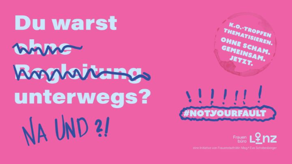 Weitere Informationen zur aktuellen K.O.-Tropfen Kampagne „SO WHAT?! #notyourfault“ des Frauenbüros der Stadt Linz in Kooperation mit FIFTITU% >> Hier klicken!