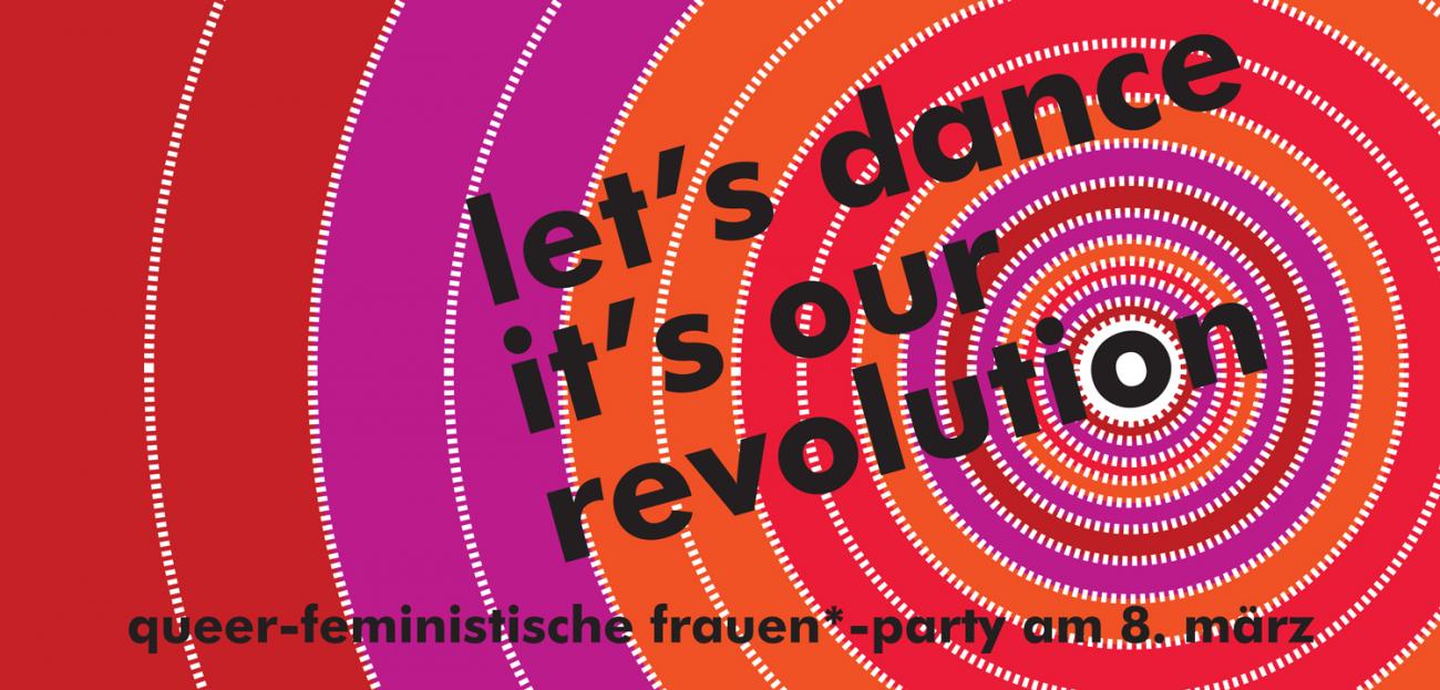 Am 8. März, dem Internationalen Frauentag, veranstalten wir unter dem Motto „Let's dance, it's our revolution!“ eine queer-feministische Frauen*-Party und laden Euch dazu sehr herzlich ein. Gemeinsam wollen wir etwas verändern, und gemeinsam wollen wir auch tanzen, feiern und auf unsere bereits erreichten Ziele anstoßen.