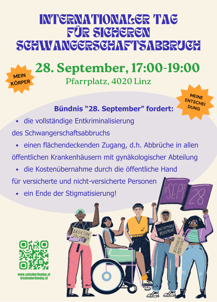 Deshalb, diesen Donnerstag, 28.09.2023, dem International Safe Abortion Day in ganz Österreich für das Recht auf körperliche Selbstbestimmung auf die Straße gehen