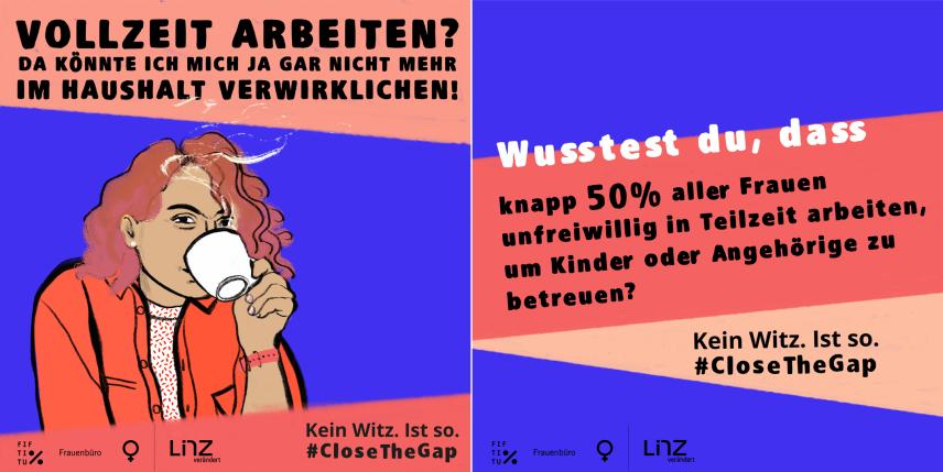 In unserer Gesellschaft werden Frauen* nach wie vor am Arbeitsmarkt (strukturell) diskriminiert. So sind Männer* überall dort überrepräsentiert, wo es um Macht und Geld geht, Frauen* dort, wo es um unbezahlte und oft nicht wertgeschätzte Sorgearbeit geht. Dieses Faktum thematisiert das Frauenbüro der Stadt Linz in einer Online-Kampagne, die von FIFTITU% konzipiert wurde.